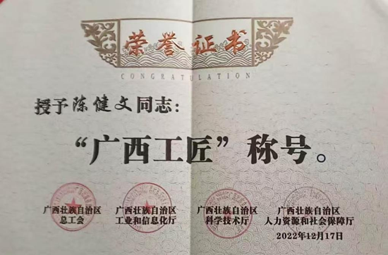 工作室负责人陈健文先后荣获广西工匠、南网工匠、南网创新先进个人等荣誉称号,工作室成员黄超刚获玉林市劳模、陈恒清获玉林市工匠称号。