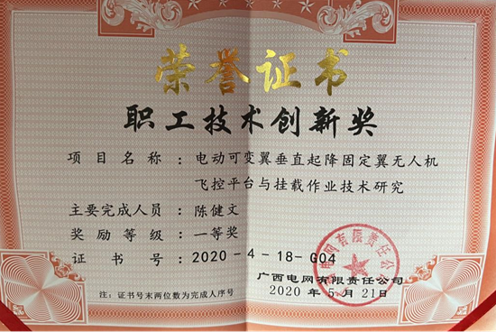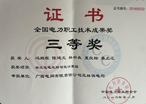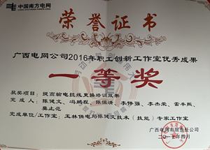 《送电线路智能技算器》全国电力职工技术创新三等奖,南方电网公司职工技术创新成果二等奖,广西电网公司职工技术创新成果一等奖;《提高输电杆塔拉线培训装置》南方电网公司职工技术创新成果展铜奖。《警示牌快速安装工具》、《输电线路接地网验收便捷工具》在南网挂网试运行。