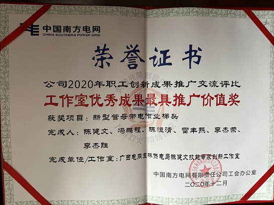 2021年,项目《管母带电作业梯头》为全国首创,打破管母常规带电作业零的突破,目前挂南网商城出售,获全国能源化学地质系统优秀职工技术创新成果一等奖,全国电力职工技术创新二等奖,南方电网公司职工技术创新成果一等奖,广西电网公司职工技术创新成果一等奖,南方电网公司最具推广价值奖;