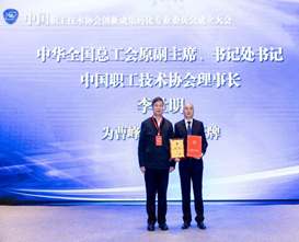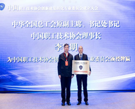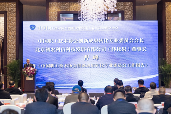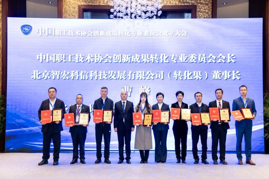会上,中国技协理事长李世明宣布中国职工技术协会创新成果转化专业委员会正式成立,并为专委会颁授牌匾,为专委会会长、北京智宏科信科技发展有限公司(转化果平台)董事长曹峰颁发铭牌和证书。