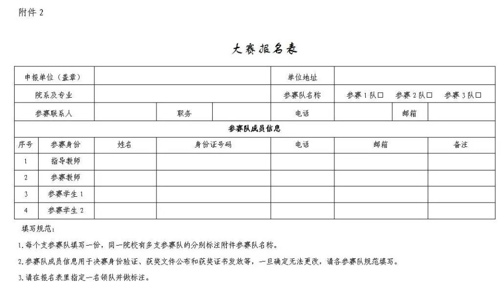 以参赛队为单位,填写报名表(见附件2,须加盖所在单位章)并提交电子版及初赛作品至指定邮箱(邮件主题以“赛项名称+参赛单位+参赛队1/2/3+”为命名)。各参赛队应在9月19日24点前完成报名并提交初赛作品,涉及实物作品的应按竞赛规程要求邮递。