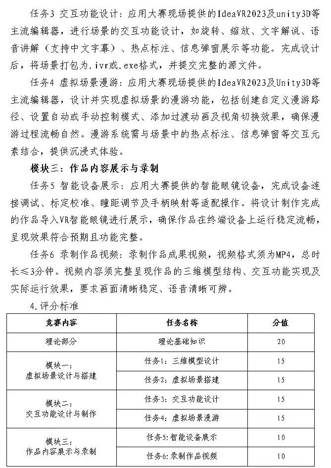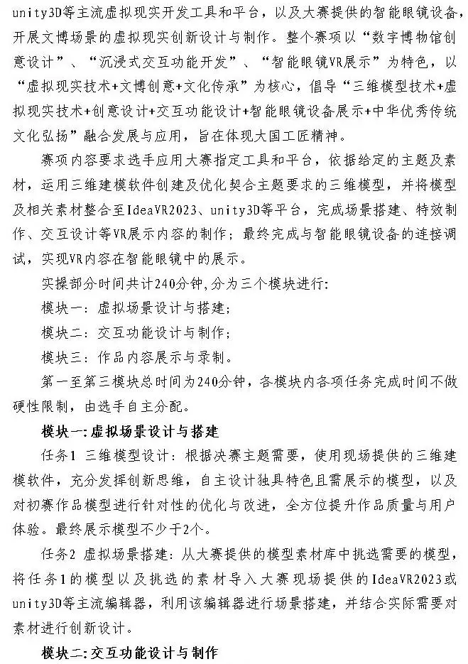 1.数字博物馆设计。本赛项面向虚拟现实技术、数字媒体技术、计算机科学、软件工程、文物保护与修复等相关专业,旨在培养服务于数字文创、数字文博、智慧文旅、教育培训等产业需求的复合型高素质技能人才,着重提升参赛者在三维数字化建模、虚拟场景空间搭建、VR交互功能设计、沉浸式内容开发、虚拟现实系统集成(含硬件适配)等技术领域的综合应用能力,技术体系涵盖三维建模设计、场景空间搭建、材质与纹理制作、VR交互功能设计、虚拟展示技术及终端展示设备操作等核心技能。对应三维建模师、VR场景架构师、Unity开发工程师、交互技术美术师、数字内容策划师、虚拟展厅设计师、VR系统运维工程师等职业岗位。