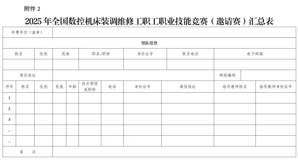3.报名方式:各参赛单位请于2025年11月3日17:00前将《2025年全国数控机床装调维修工职工职业技能竞赛(邀请赛)参赛选手登记表》(附件1)、《2025年全国数控机床装调维修工职工职业技能竞赛(邀请赛)汇总表》(附件2)(Word电子版和盖章扫描件)发送至承办单位邮箱:zkjdgcxyjw@163.com,逾期不接受报名。