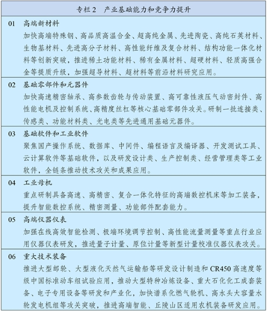 ——提升产业链自主可控水平。加快突破一批重大基础技术、工艺和产品,推进先进材料、跨尺度制造等创新应用。实施重大技术装备攻关工程,突破一批标志性重大技术装备。建立健全产业链供应链安全风险评估和应对机制,持续增强稀土、稀有金属、超硬材料等竞争优势。